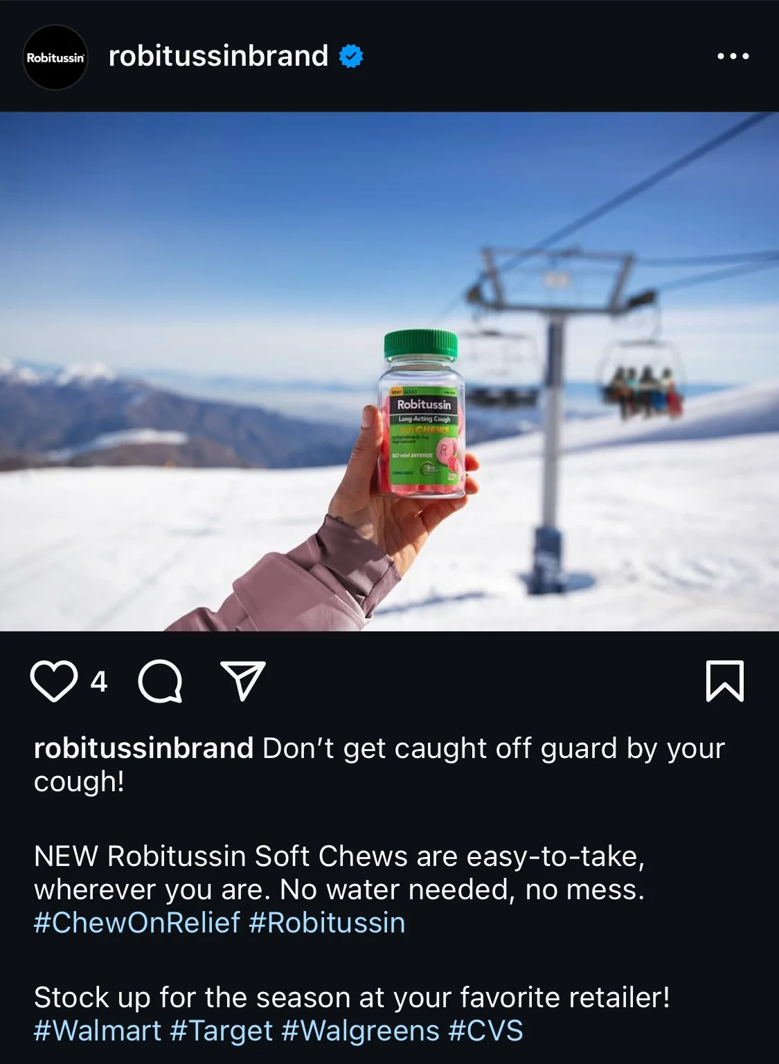Use humor to dramatize how much more convenient Robitussin soft chews are than cough syrups when enjoying winter activities.